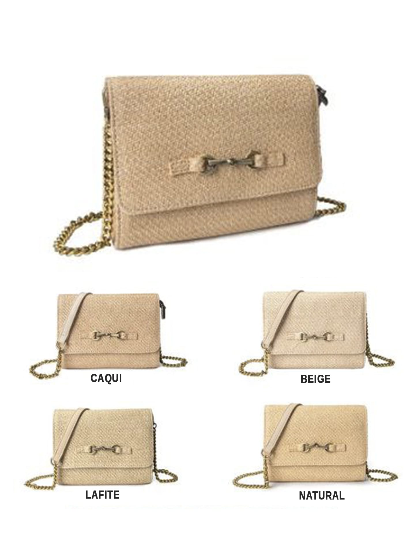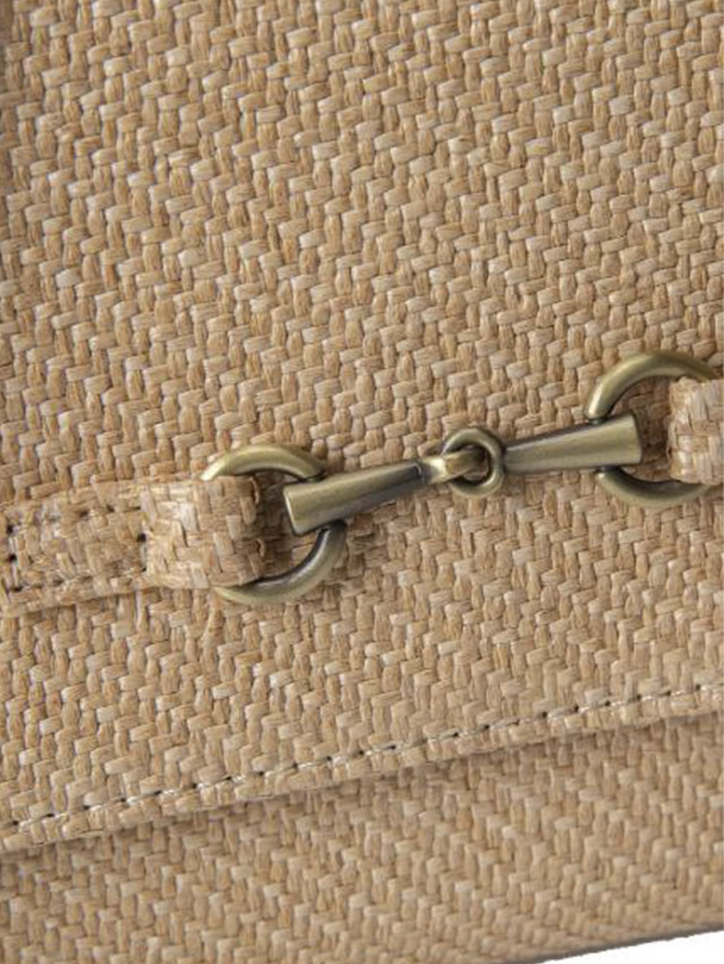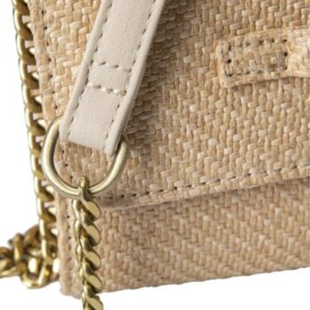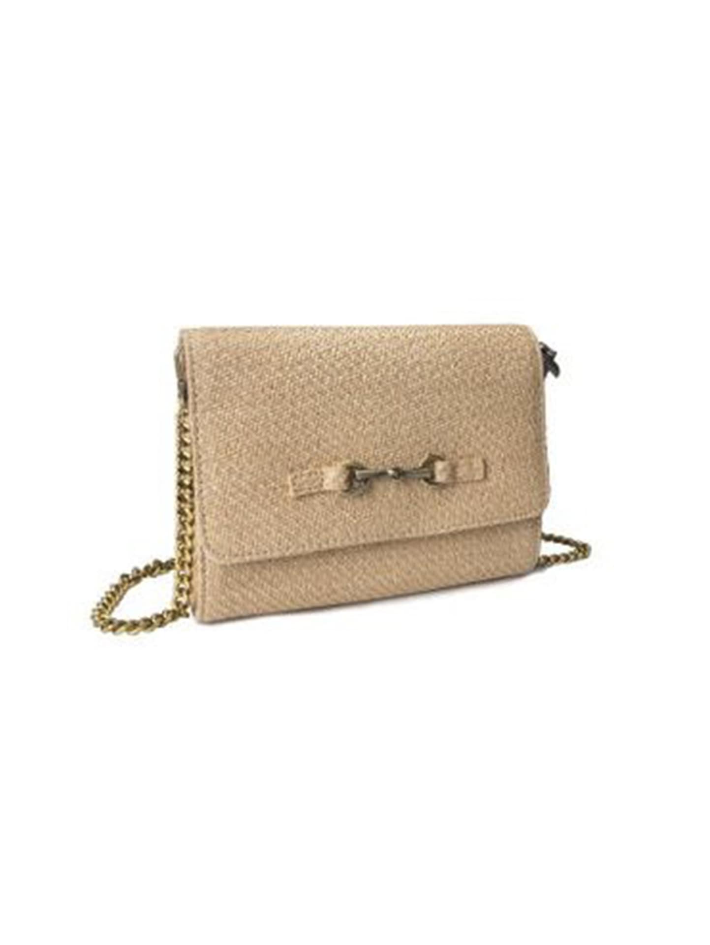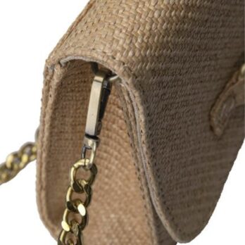 Bolso bandolera de rafia trenzada con cadena dorada y cierre imán. Ligero, elegante y versátil.