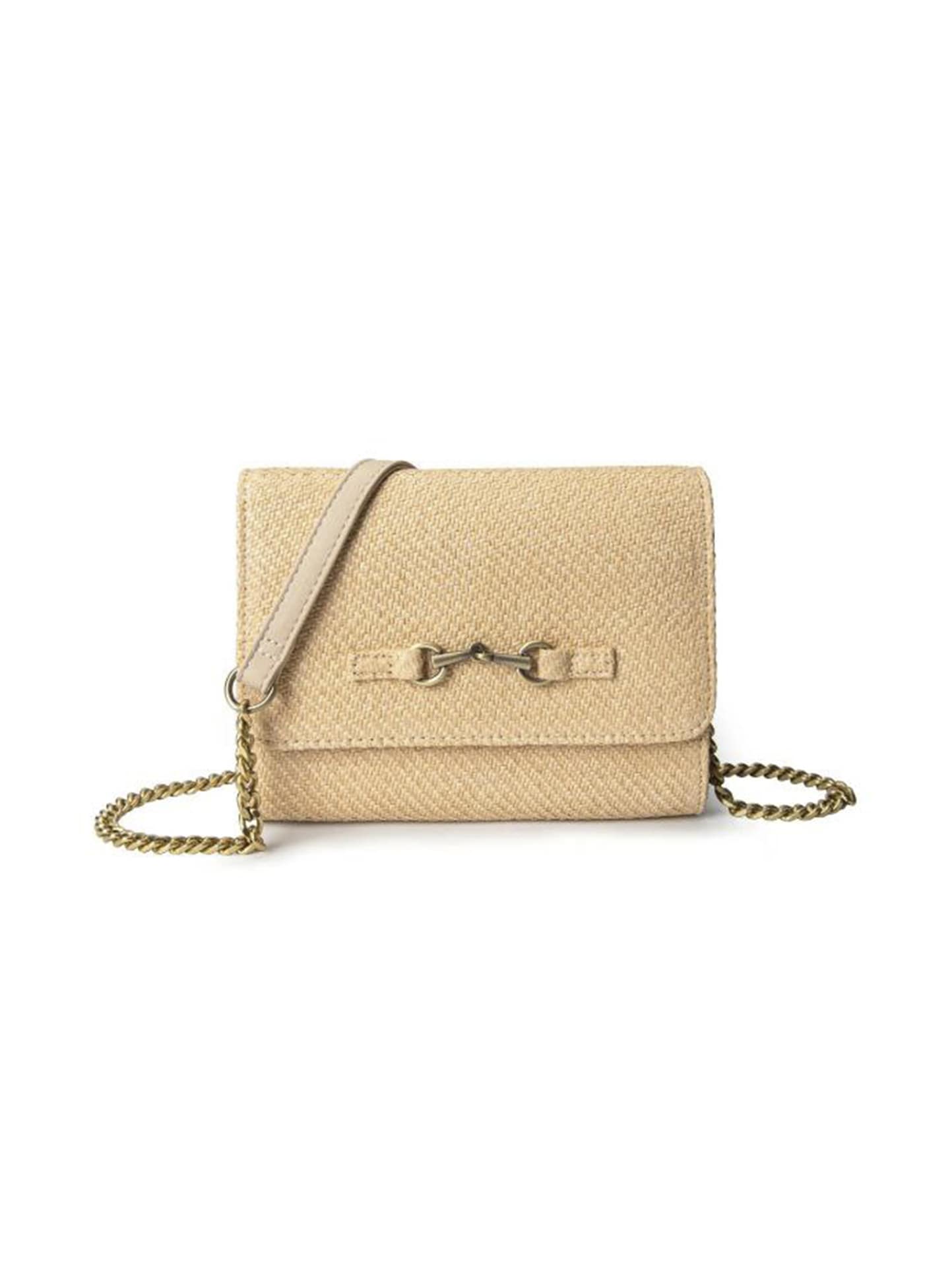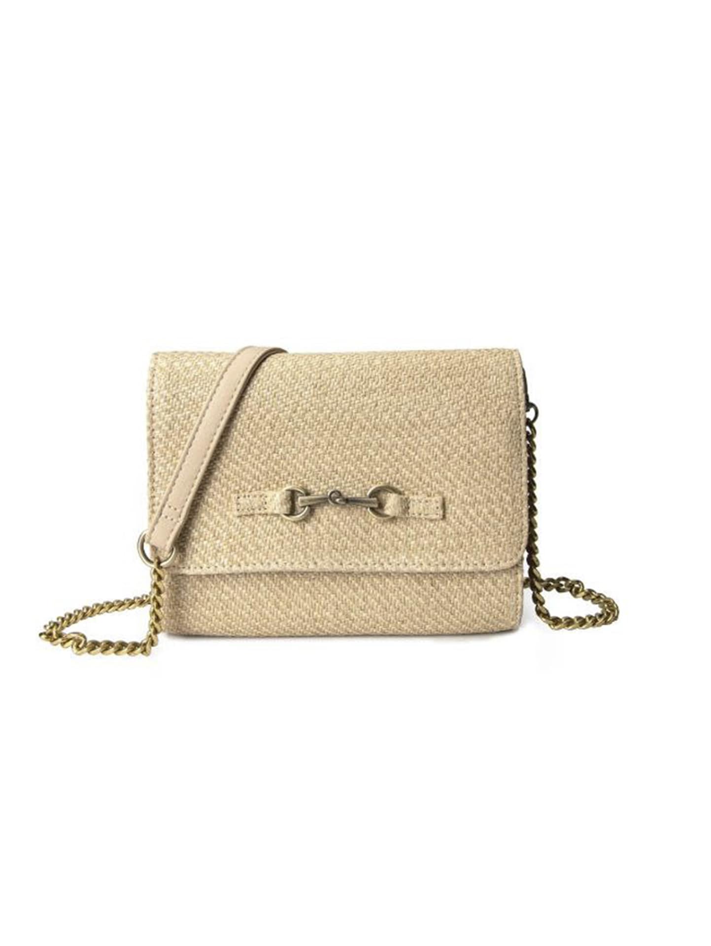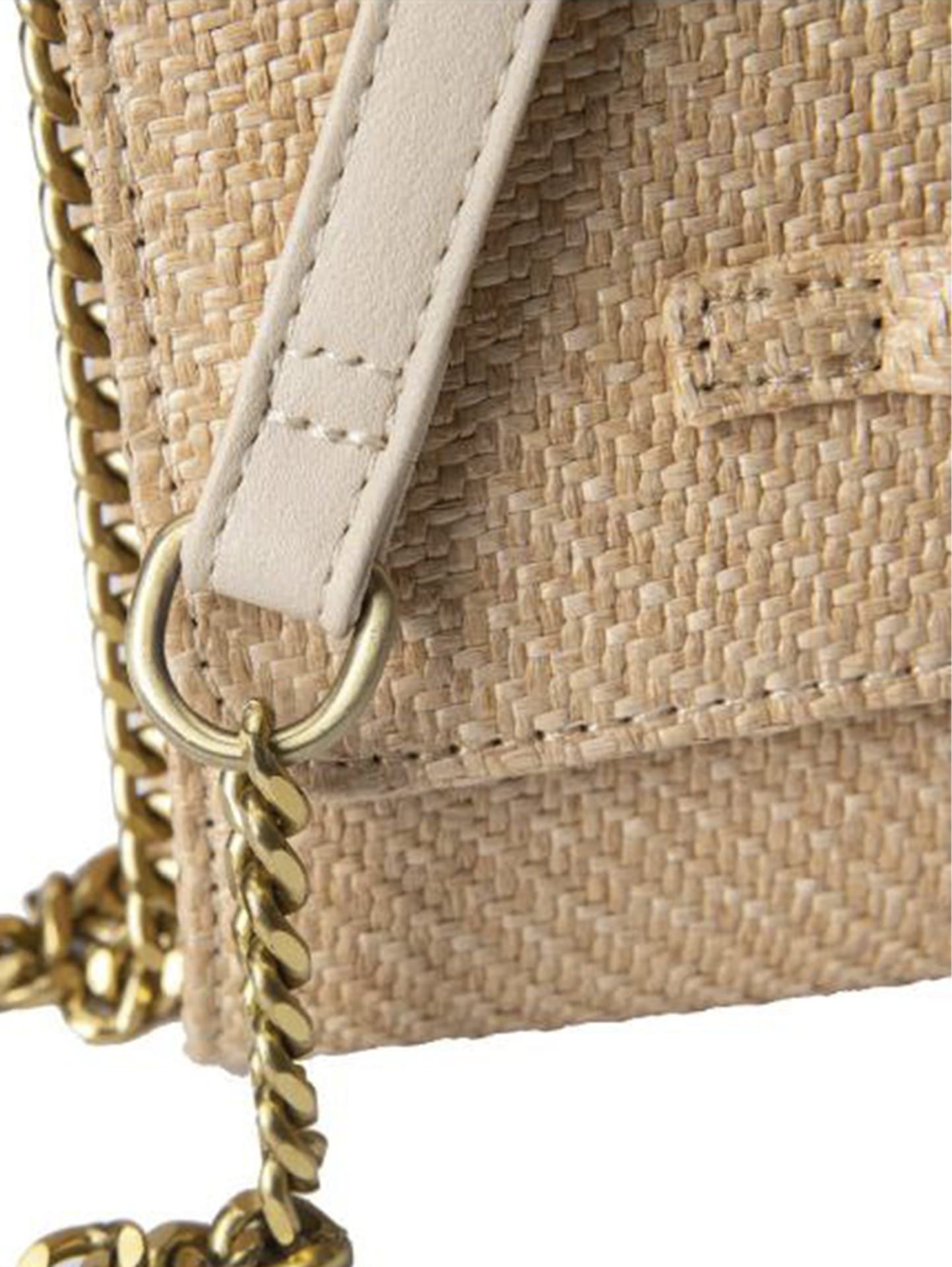 Bolso bandolera de rafia trenzada con cadena dorada y cierre imán. Ligero, elegante y versátil.