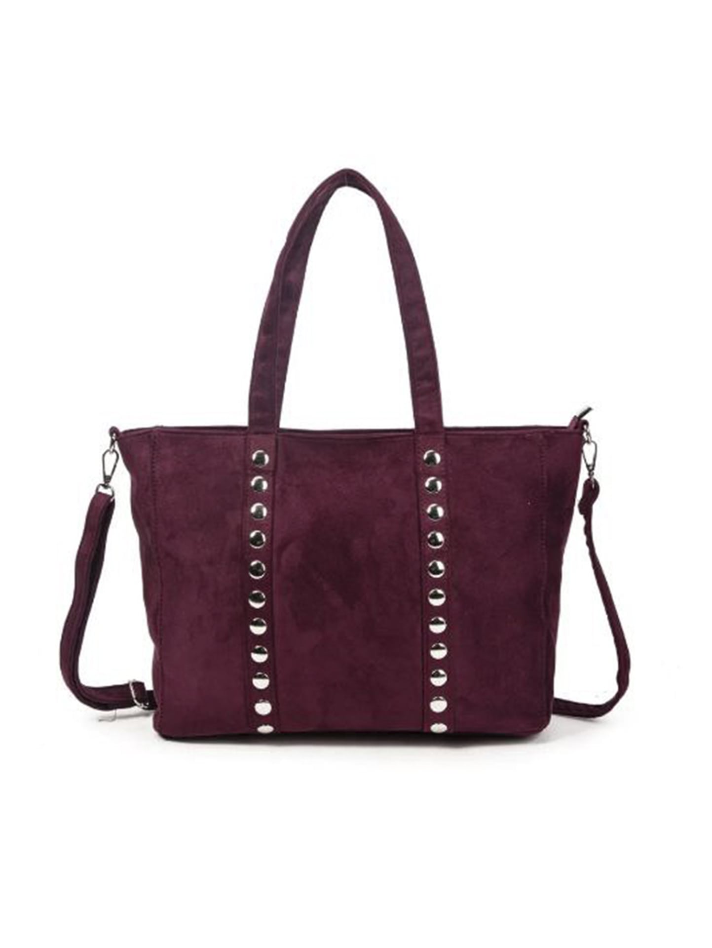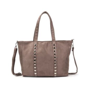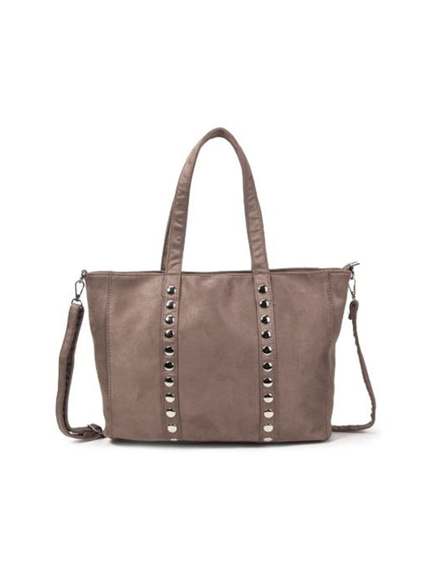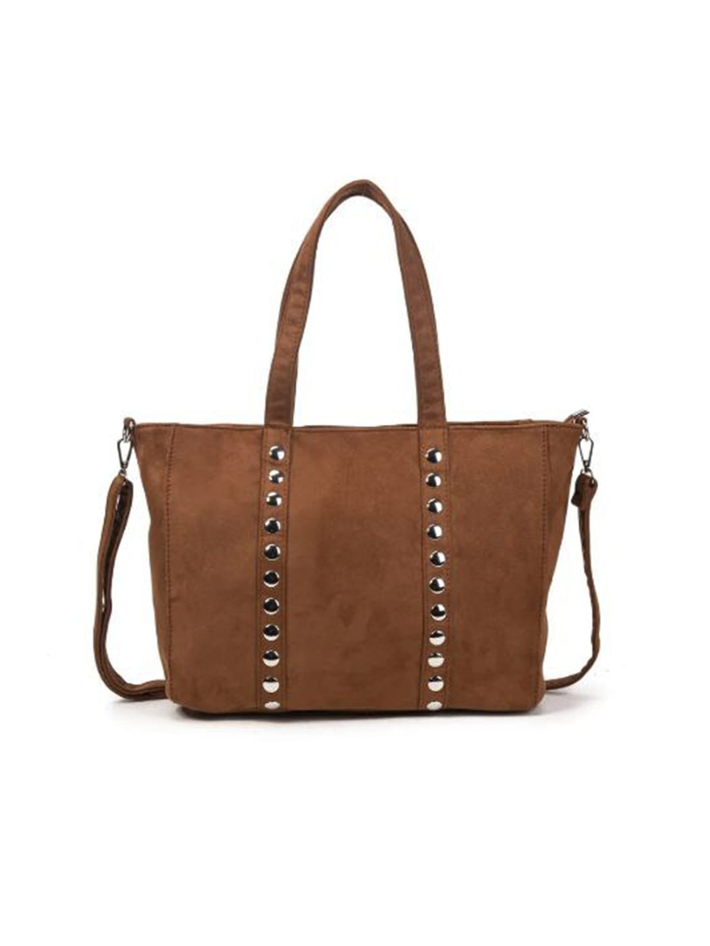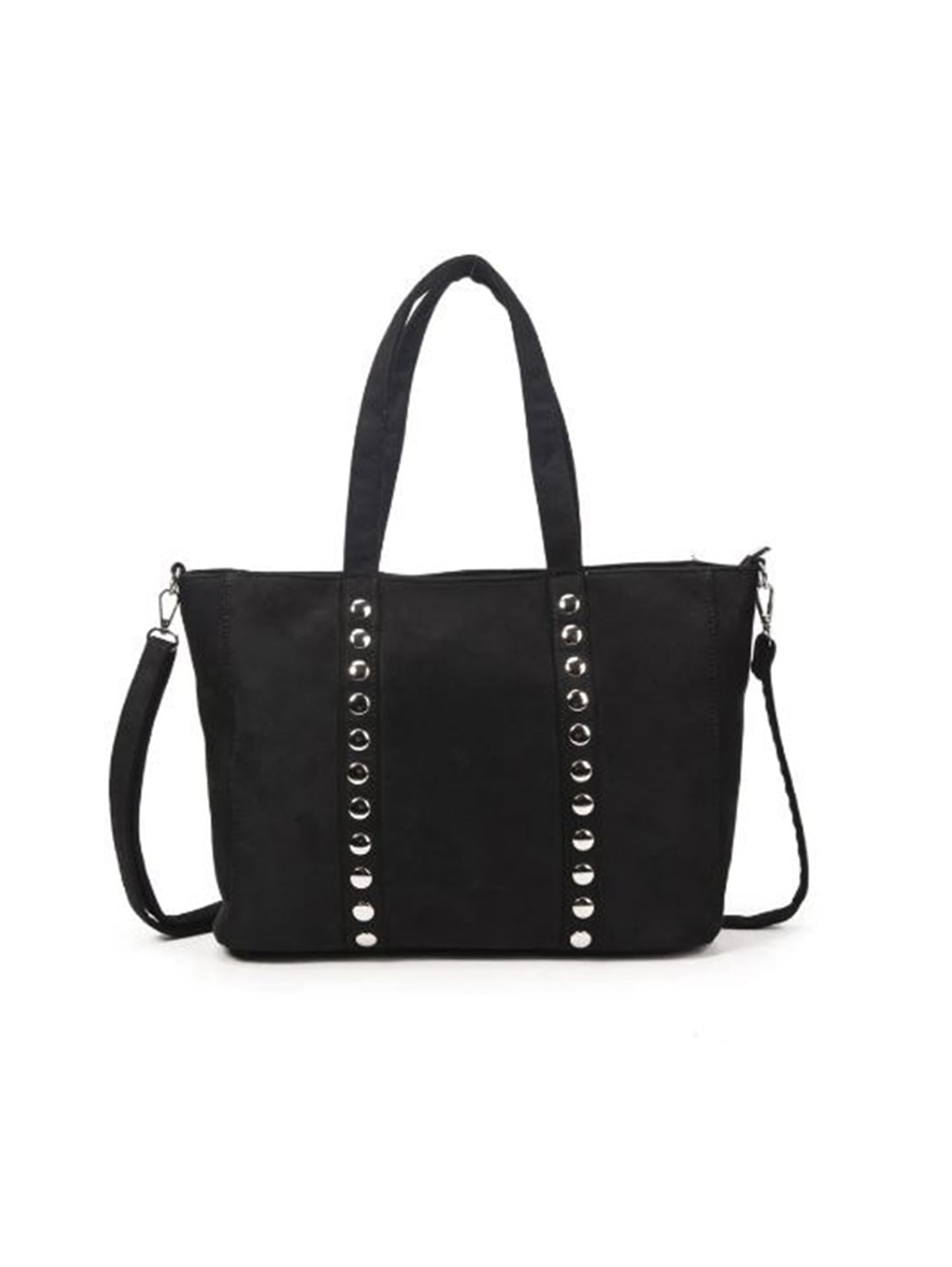 Bolso shopper amplio con detalles de tachuelas metálicas, doble asa y correa regulable. Elegante, práctico y disponible en varios colores.